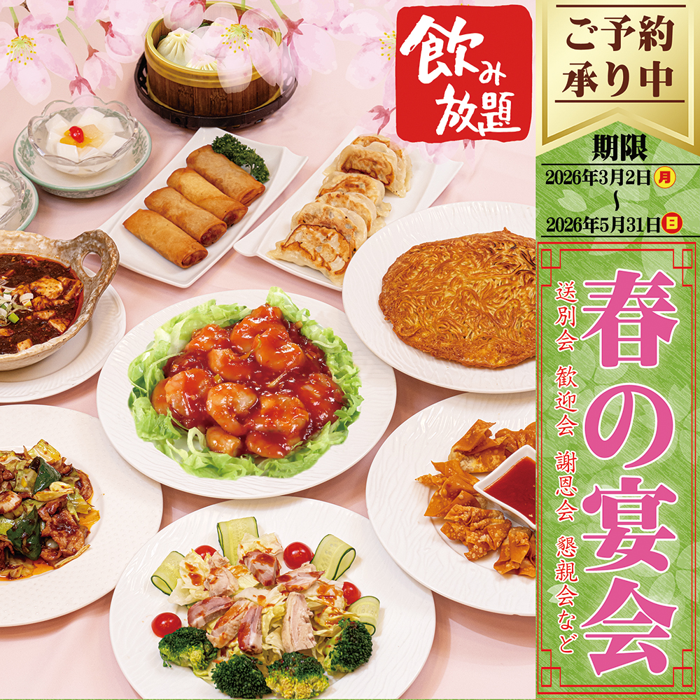 | 「大海老のチリソース炒め」や「フカヒレスープ」などの豪華メニューに加え、当店の名物料理「梅蘭焼きそば」など含む全10品+2.5時間飲み放題が付いた今だけのお得なコース内容になっております。送別会・歓迎会・各種ご宴会などにご利用くださいませ。 |